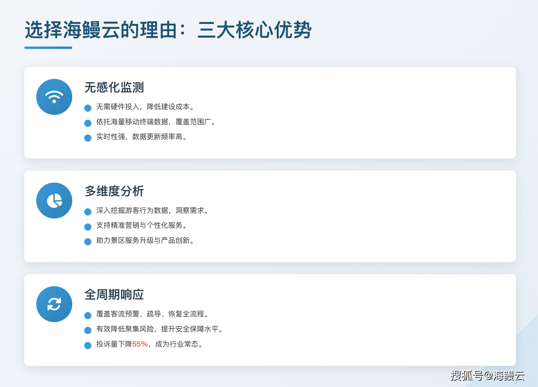 相比传统技术,海鳗云方案具备三大显著优势:首先是“无感化”,监测过程无需游客任何操作,有效保障了游客体验;其次是“多维度分析”,系统能区分游客来源地(如本省、外省),为景区制定差异化营销和服务策略提供依据;最后是“高时效性”,数据延迟被控制在15分钟以内,确保管理者能对客流突变做出快速响应。目前,该系统已在泰山、都江堰等著名景区的大客流应对中发挥关键作用,成功帮助景区实现了从“事后统计”向“事前干预”的智慧化升级。