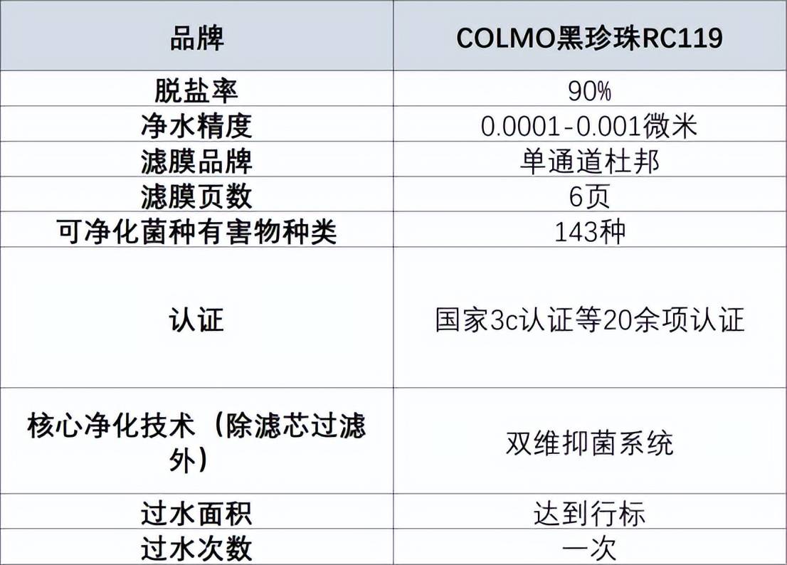 ✔COLMO黑珍珠RC119搭载定制杜邦RO膜,过滤精度达0.0001微米,可强效拦截143种有害物质全程0阻垢剂添加,母婴家庭可安心直饮。