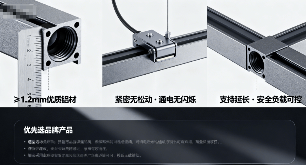 最后是扩展性,需考虑轨道是否支持拼接延长,以及未来可能增加的灯具功率总和是否在轨道安全负载之内。