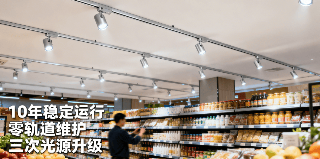 在这十年间,超市经历了从卤素灯到节能灯再到LED灯的两次大规模灯具升级,但底层的轨道系统始终未变。