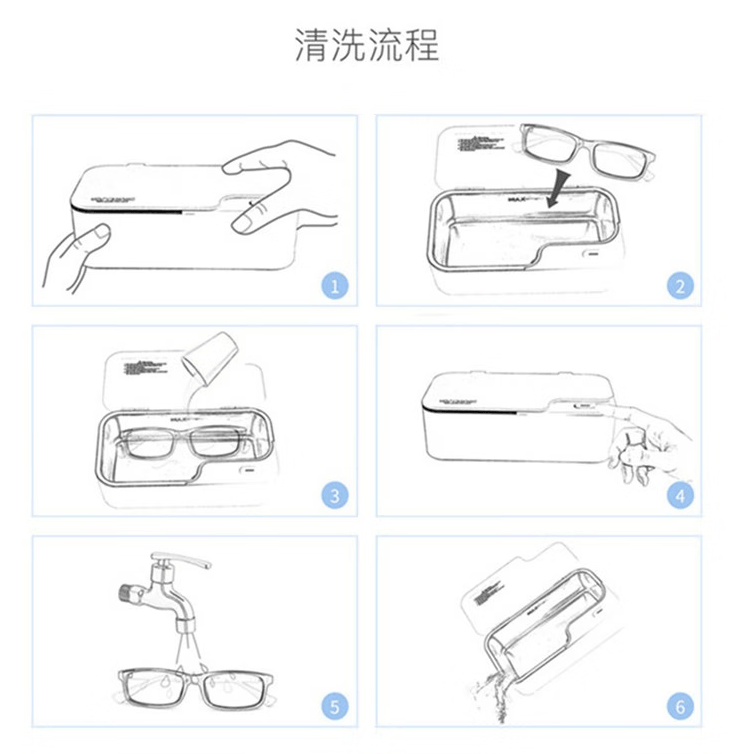 护物设计:机身采用的温和的超声波振频清洗方式,利用超声波“空化效应”的作用用于眼镜等物品清洗,效果会比手动清洗更加好,并且不容易划伤镜片!