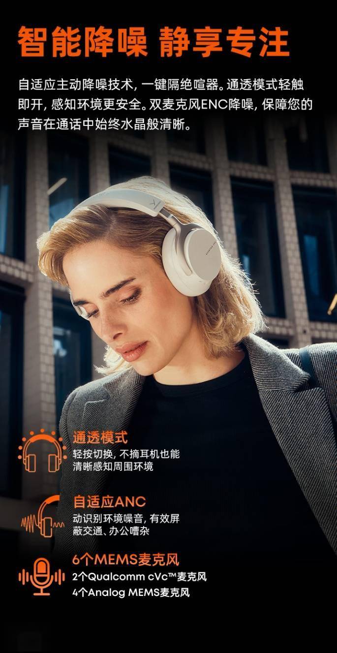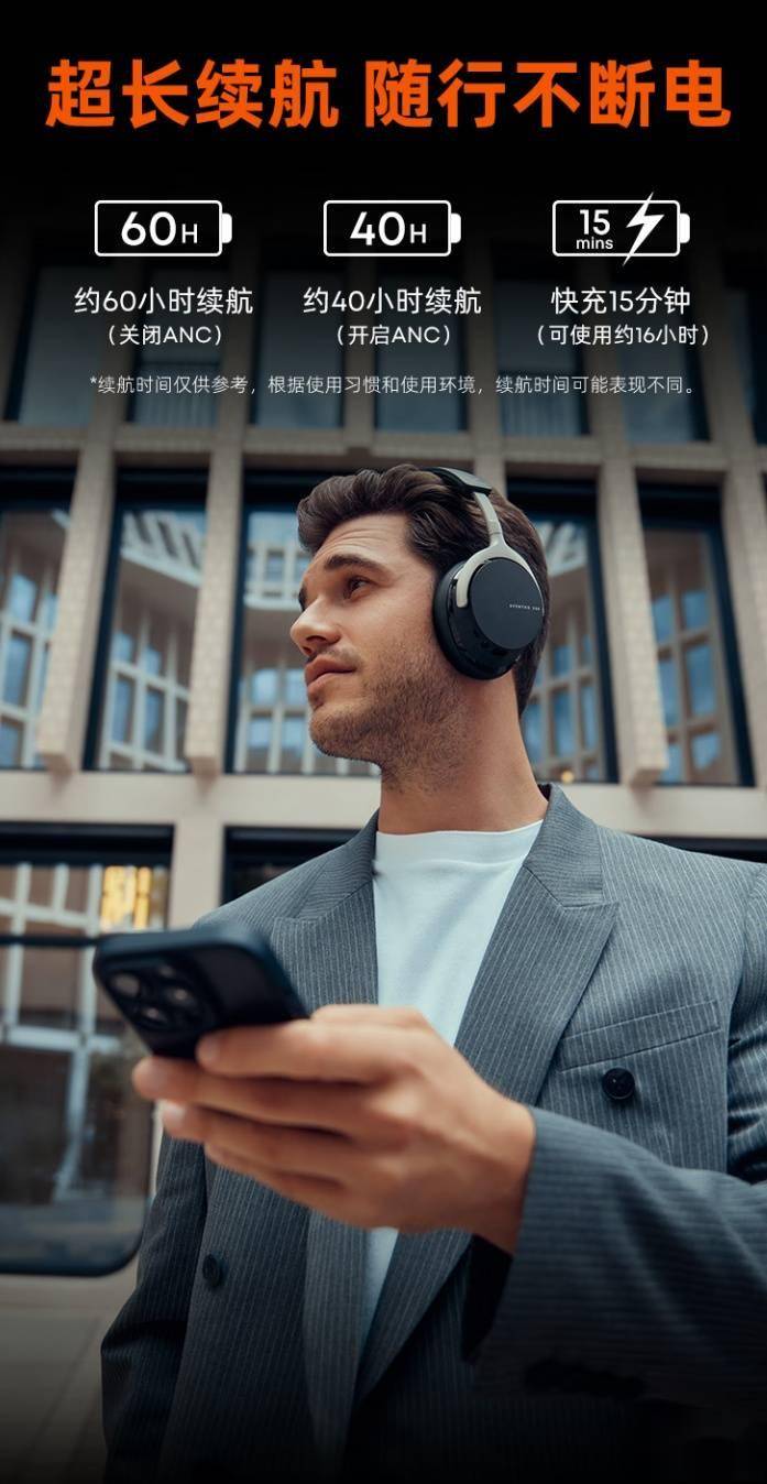 据介绍,这款耳机搭载 45mm 拜雅驱动单元,可呈现 10Hz-22000Hz 宽广声场与精准解析力,配备自适应主动降噪技术,支持通透模式,可通过轻触机身打开,内置双麦克风 ENC 降噪,可让通话过程中减少杂音。