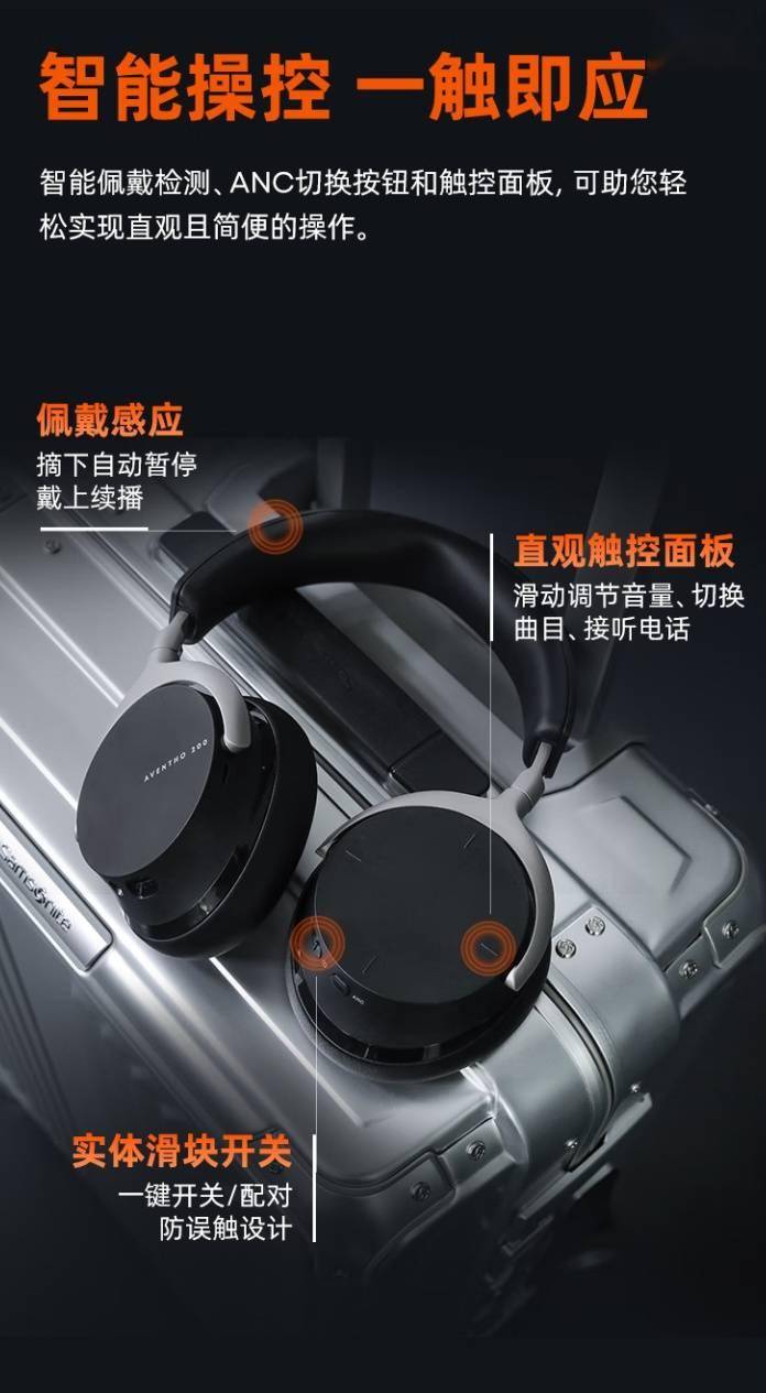 功能方面,这款耳机搭载智能佩戴检测、ANC 切换按钮和触控面板,支持佩戴感应,摘下耳机就能自动暂停音乐,右侧的触控面板可直观调整音量、切换曲目、接听电话等,支持连接双设备,可将耳机与手机、笔记本协同使用。