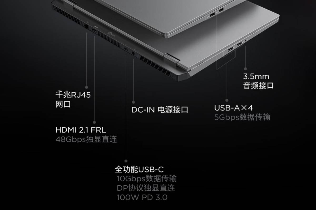 扩展接口部分,笔记本采用了4A1C的方案。没错它有4个USB-A接口和1个USB Type-C接口,但最高也只到10Gbps速率,没有更高。另外,笔记本还有千兆网卡和HDMI2.1,可以支持4K120Hz或者8K60Hz输出。