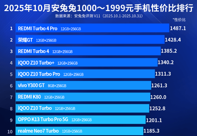 最后,在2025年10月份安兔兔1000—1999元手机性价比排行榜中,REDMI K80和iQOO Z10 Turbo分列第七名和第八名。在安兔兔平台上,这两款智能手机的性价比评分分别为1260.0分和1252.8分。在此之后,OPPO K13 Turbo Pro 5G和realme Neo7 Turbo分列第九名和第十名。在安兔兔平台上,这两款智能手机的性价比评分分别为1201.1分和1185.3分。其中,屏幕方面,OPPO K13 Turbo Pro 5G这款智能手机搭载了一块6.8英寸的OLED直屏,1.5K分辨率、最高1600nit全局亮度,以及120Hz 高刷新率。