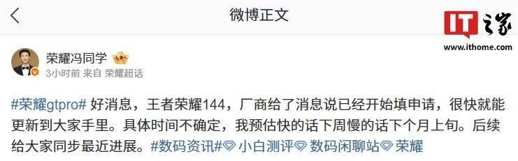 IT之家 11 月 23 日消息,荣耀游戏研发工程师 @荣耀冯同学 今日发文透露,《王者荣耀》144Hz 模式已开始填申请,很快就能更新到用户手里。具体时间不确定,但预估快的话下周慢的话下个月上旬。