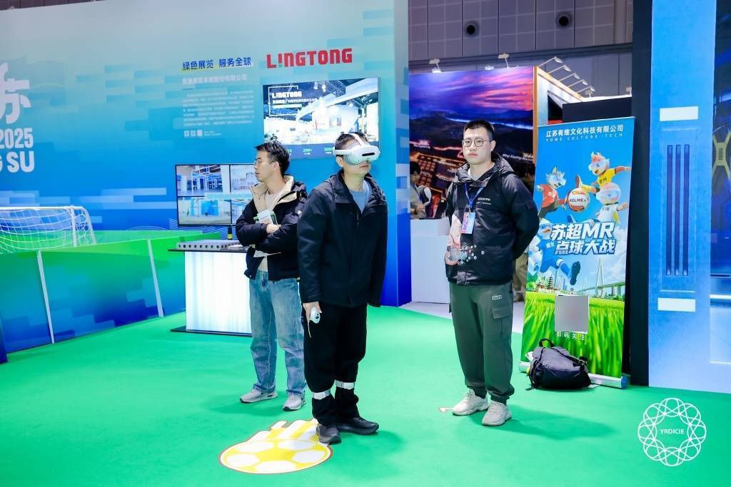 江苏有维文化的足球体感互动在展区尤为醒目。这一沉浸式MR互动游戏充满趣味。观众佩戴混合现实眼镜进入虚拟场景,通过翻动面前的书本选择射门者。有意思的是,每位射手分别代表江苏十三市的特色形象,翻页时,整个场景化作巨型立体书同步展开,展示对应城市的地标、非遗与文化元素,寓教于乐地展现地域魅力。在这个科技感与互动性的游戏中,可以沉浸式感受“苏超“乐趣。