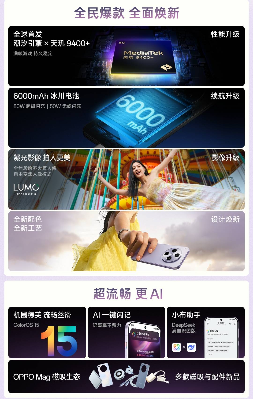 对于OPPO Reno15 Pro和OPPO Find X8s+,亓纪的想法是这样的:如果你喜欢自拍,并且有拿手机直播的需求,OPPO Reno15 Pro应该是更好的选择,并且还带来了更高的颜值和机身质感。如果你有玩大型游戏的需求,搭载天玑9400+的OPPO Find X8s+更好用,同时在长焦镜头和外围配置上都有更好的表现。