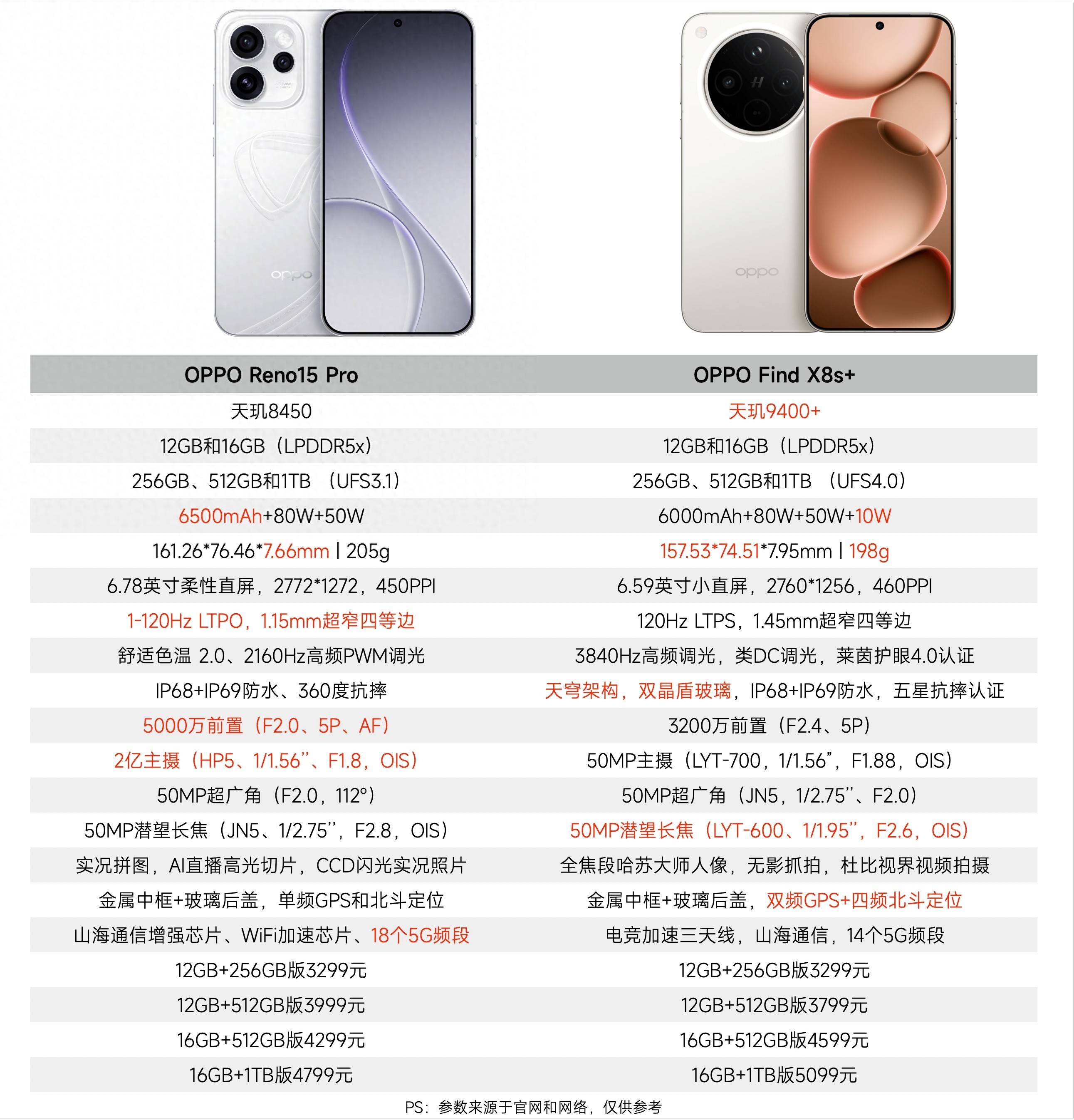 看到两款机型的售价都是3299元,一款是最新的自拍轻旗舰,一款是上半年发布的影像旗舰,于是就想拿来横向对比一下。结论其实也很简单,OPPO Reno15Pro的优势是自拍体验和后置主摄,还有更薄的机身和更窄的四边框,OPPO Find X8s+的优势是性能、无线充电,耐用性和长焦镜头。如果与媳妇或女友的选择相反,请记得以她的选择为准,以下是两款机型的详细内容。