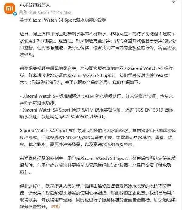 小米总算发了声明:潜水手表能潜水,但你得买对型号。