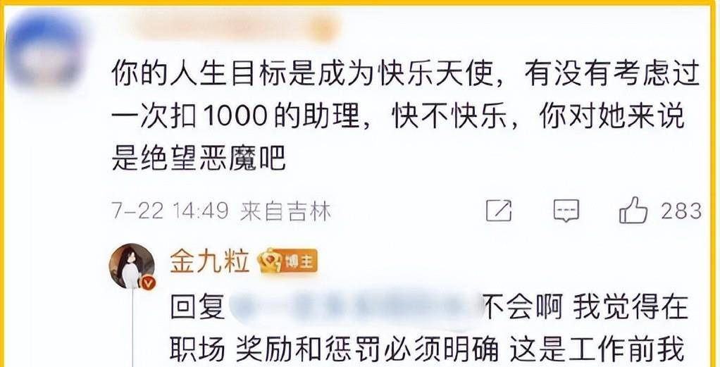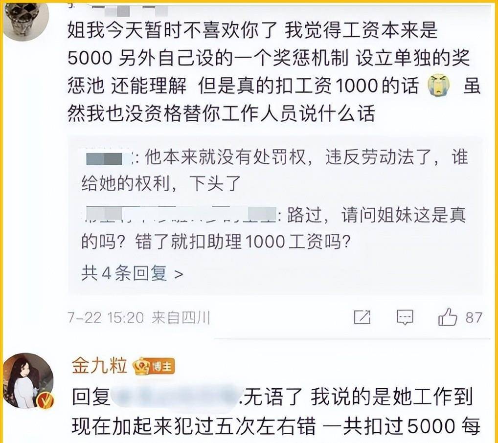 喜剧演员金靖也曾因为对待助理的方式引起讨论。她曾在网上说,助理如果犯错,一次就扣一千块。这话一出,很多人觉得她太严厉了。