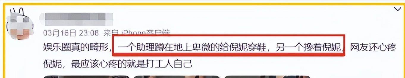 类似的情况在别的明星身上也出现过。比如王子文被拍到在化妆时,助理跪着为她举话筒;倪妮的助理曾蹲着帮她整理鞋子;赵露思也有工作人员跪着帮她穿鞋。