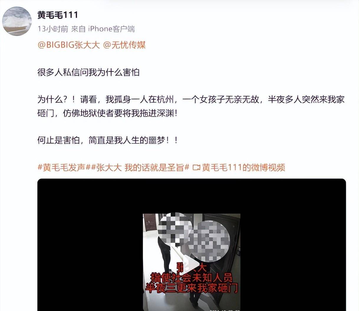 张大大曾经有个助理叫黄毛毛,后来在网上发文说,自己因为对工作提了点建议,就被张大大骂了很久,还被关在房间里不让走,甚至被逼着承认自己是“狗”。据说整个过程持续了近两小时,之后这位助理选择了离职。