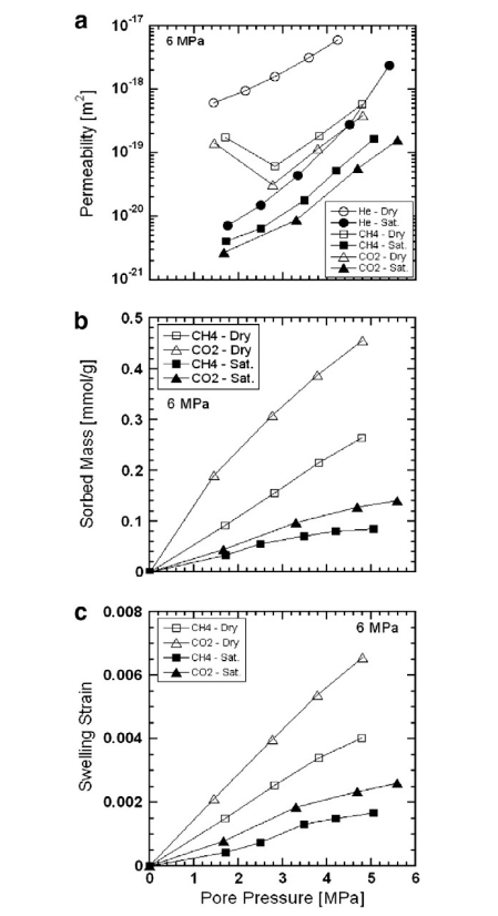 大量的实验工作已经用于研究煤的气体渗透率及其演变。实验室测量的煤对吸附气体(如CH₄和CO₂)的渗透率已知低于对非吸附或轻吸附气体(如氩气和氮气(N₂))的渗透率。随着围压从0.1增加到70 MPa,渗透率可能会降低多达五个数量级。在恒定总应力下,吸附气体的渗透率随着孔隙压力的增加而降低,这是由于煤的膨胀,并且随着孔隙压力的降低而增加,这是由于基质收缩。在CO₂注入过程中,观察到反弹压力对应于最低渗透率。吸附气体在煤中的渗透率被发现是气体暴露时间的函数。渗透率还受到水的存在和水饱和度的影响。基于现场和实验室实验结果,已经为煤层开发了几种渗透率模型。