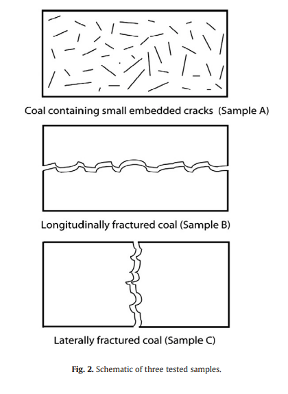 特别是,在恒定围压和恒定轴向应力下,随着气体压力的增加,以及在恒定气体压力下,随着围压和轴向应力的增加,进行渗透率、吸附和膨胀实验。使用非吸附的He作为渗透剂,检查有效应力驱动的体积变化的影响。使用吸附气体CH₄和CO₂检查膨胀的叠加影响。我们依次报告这些结果,首先是含有小嵌入式断层的样品(样品A),然后是含有轴向(样品B)和横向(样品C)离散断层的样品。图2显示了这三种样品的示意图。