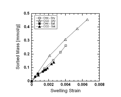先前的研究表明,当煤暴露于N₂、CH₄和CO₂时会发生膨胀,体积应变范围为0.1%到15%,在压力高达20 MPa和温度高达55°C的条件下。煤膨胀应变随着孔隙压力的增加而增加,CO₂引起的应变通常大于CH₄引起的应变。膨胀应变可能是可逆的或不可逆的。膨胀应变与吸附气体的量或体积之间的关系被发现是线性的或非线性的。湿煤的膨胀应变小于干煤的膨胀应变,这说明了水对膨胀应变的影响。