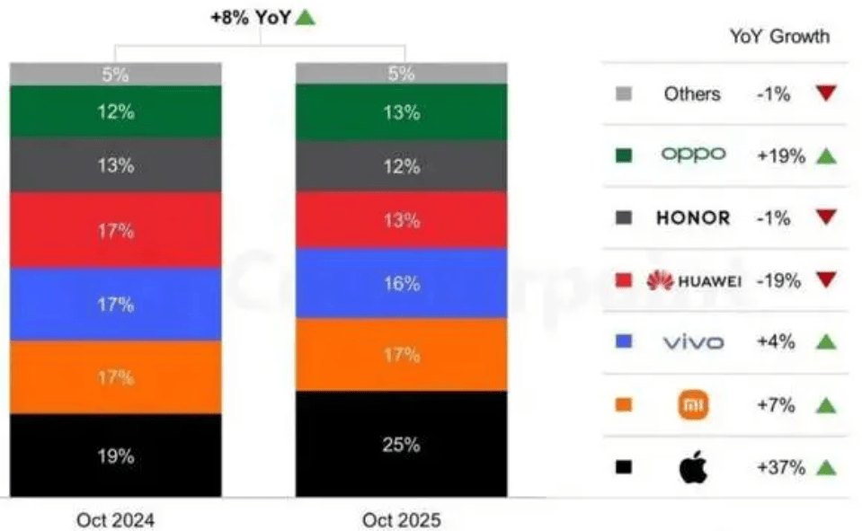 今年,苹果的iPhone 17系列也同样面临了这样一场批评的风暴。各种声音扑面而来,甚至有人预测,iPhone 17系列的销量将会在中国市场迎来重创。然而,最近Counterpoint发布的数据显示,苹果的这一轮“被批评”并未影响其在中国市场的表现,反而让所有质疑者再次感到“打脸”。根据Counterpoint的分析报告,10月份中国手机市场同比增长了8%,其中苹果的热销功不可没。更为惊人的是,苹果在10月的市场份额达到了25%,这意味着每卖出的4台手机中,就有一台是苹果。对于苹果来说,这无疑是近年来的巅峰表现。