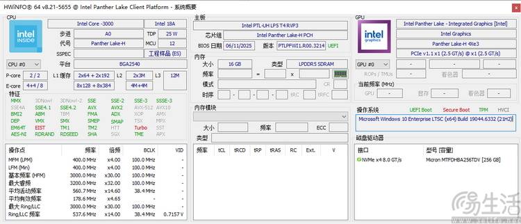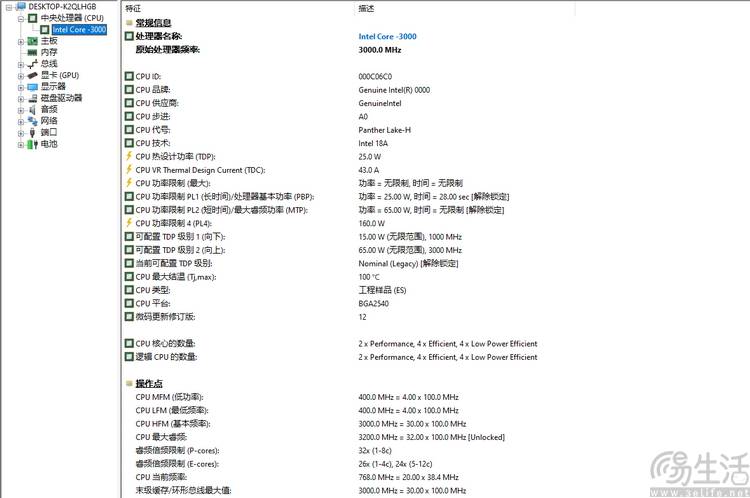 不过让我们稍感意外的是在AIDA64里,这颗ES版本的CPU倒是被识别为25W-65W的标压版“Panther Lake-H”。所以这是否意味着,BIOS的显示信息或软件的识别信息里有一个出错了呢?