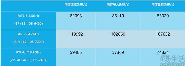 首先我们将这个Panther Lake-ULV平台的内存性能,与我们三易生活手头的另外两颗英特尔CPU进行了比对。它们同样是ES版本的早期型号,只不过频率上要高很多。所以就能看出,即便是搭配了7467MHz的高频LPDDR5X内存,但CPU本身算力不够的话,依然会“带不动”内存吞吐量。