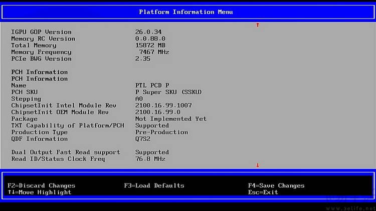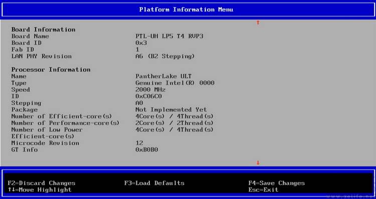 可以看到,它确实是RVP(参考验证平台)。但有意思的地方在于,其CPU类型显示为“Panther Lake ULT”,即超低电压处理器。换句话说,这颗处理器的型号可能是“酷睿Ultra 3XXU”,而非代表标压移动平台的“3XXH”。