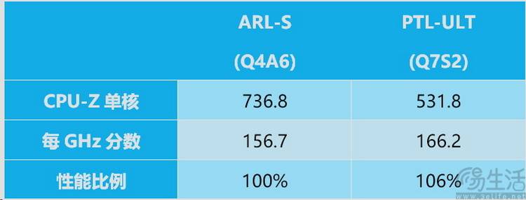 我们将这颗Panther Lake-ULT处理器的单核跑分,与此前的Arrow Lake-S处理器进行量化对比就会发现,尽管前者有着功耗上更大的限制、所搭配的内存延迟也高许多,但新的Cougar Cove大核还是在低压笔记本平台表现出了比目前英特尔最新台式机处理器高出大约6%的P核同频性能。