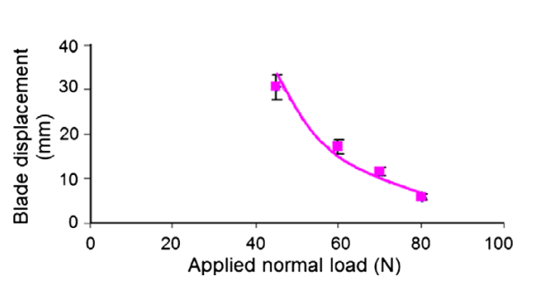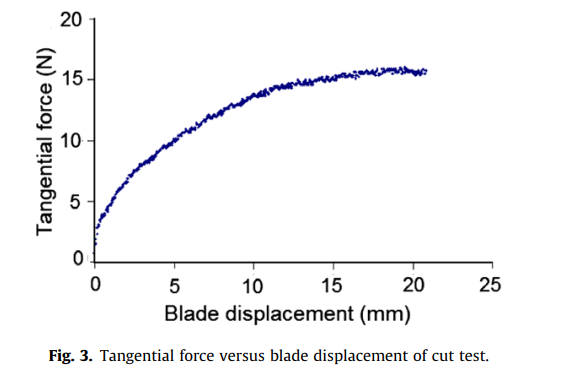 图3显示了一个典型的切割测试示例,即在施加 5 N 法向载荷下,对 1.57 mm 厚的氯丁橡胶样品进行切割时的切向力与刀片位移的关系。可以看出,该力随着刀片位移的增加而持续增大,并在切割过程中达到最大值。刀片位移的终点对应于刀片到达样品下表面并与下方的导电箔接触的时刻。切向力与刀片位移曲线下的面积表示切向力的总能量(滑动能量)。与法向力消耗的能量(5 N × 1.57 mm = 7.85 mJ)相比,滑动能量要大得多,是切割样品所需的核心能量。