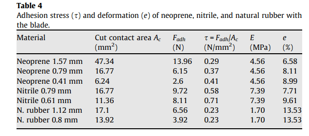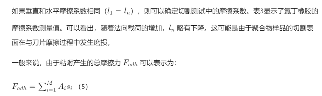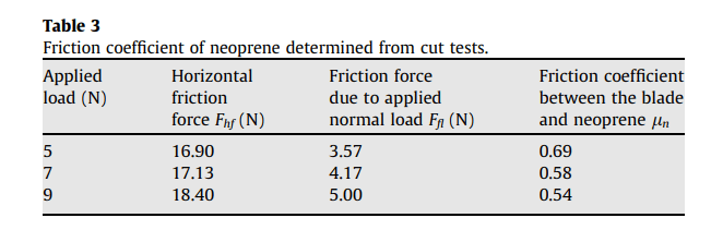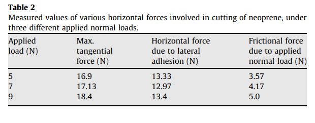 表2 在三种不同施加的法向载荷下,切割氯丁橡胶时所涉及的各种水平力的测量值