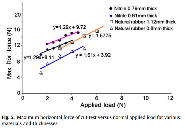 图4和图5展示了不同厚度的氯丁橡胶、丁腈和天然橡胶样品的施加法向载荷与最大水平摩擦力之间的关系。结果表明,最大水平力与施加的法向载荷呈线性关系。表示这种关系的线性方程为: