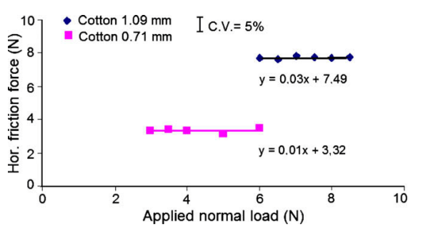图9. 两种机织棉织物的最大水平力与施加的法向载荷的关系