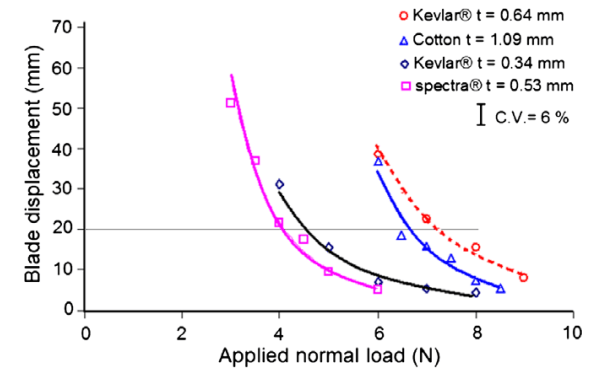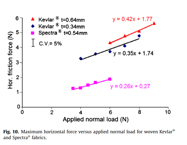 图10. 两种机织凯夫拉和斯佩克特拉织物的最大水平力与施加的法向载荷的关系