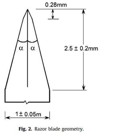 按照国际标准 ISO 13997 制作并改装了相同的装置。图1是切割测试实验装置的示意图。该方法主要包括使刀片在薄样品上滑动,并确定刀片穿透材料时的位移。该装置经过改装,可同时测量施加的法向载荷和刀片滑动运动产生的切向力。刀片由美国 Superior Electric 公司(康涅狄格州布里斯托尔)生产的步进电机驱动,型号为 M091-FC09,允许在 1 - 500 mm/min 的不同速度下进行测试。刀片为美国安全剃须刀公司生产的 GRU GRU 型,型号为 88-0121;刀片由高碳钢制成,经过热处理,硬度为 78 - 80 HRC。刀片尺寸为长 70 mm、宽 18 mm、厚(1.0 ± 0.5)mm;刀刃宽度沿直线边缘为(2.5 ± 0.2)mm,顶角 2α 在 32° - 40° 之间,两个锋利边缘的夹角为 22°。图2展示了刀片的几何形状。这种刀片用于 ISO 和 ASTM 切割测试标准。