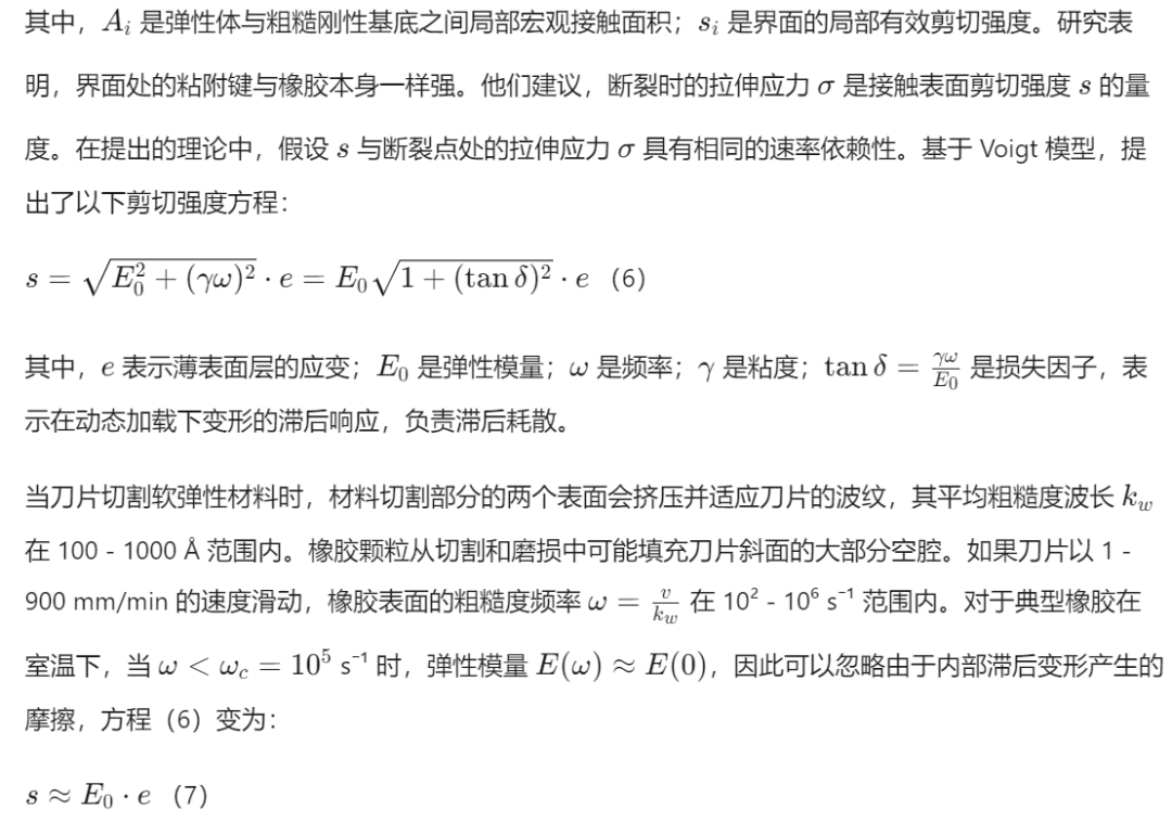 在切割过程中,水平摩擦力由两部分贡献:一是由于施加的法向载荷产生的摩擦力;二是材料对刀片侧面施加的握持力产生的摩擦力。握持力由材料与刀片界面处的分子粘附产生,与施加的法向载荷无关。它与切割表面的横截面积和材料的杨氏模量成正比。增加粘附力可以提高材料的抗切割性。而由于施加的法向载荷产生的水平摩擦力与施加载荷成正比。水平摩擦力与施加载荷的线性关系的斜率,即材料的摩擦系数,似乎与样品厚度无关,是一个材料属性。这个参数反映了在刀片尖端处,由摩擦产生的剪切应力在施加载荷下切割材料时的有效性。因此,增加摩擦系数可能会降低抗切割性。在大多数切割防护材料的情况下,由于握持产生的粘附力远大于由于施加的法向载荷产生的摩擦力。已经提出了一个理论模型来计算水平摩擦力、粘附力和摩擦系数。材料 - 刀片接触表面处粘附键的平均剪切强度取决于材料的杨氏模量和滞后耗散能力。理论计算已经得到验证,并与实验值一致。