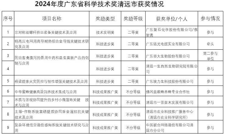 佛冈县顺蜂养蜂专业合作社、清远市一景苗木发展有限公司、清远市农业科技推广服务中心(清远市农业科学研究所)、中国联合网络通信有限公司清远市分公司4家单位荣获科技成果推广奖。这些单位积极推动科技成果落地应用,在农业与信息通信领域成果深度贴合民生需求,在促进农业增效、农民增收和社会信息化水平提升等方面成效显著,为清远的乡村振兴和社会发展提供了坚实有力的科技支撑。