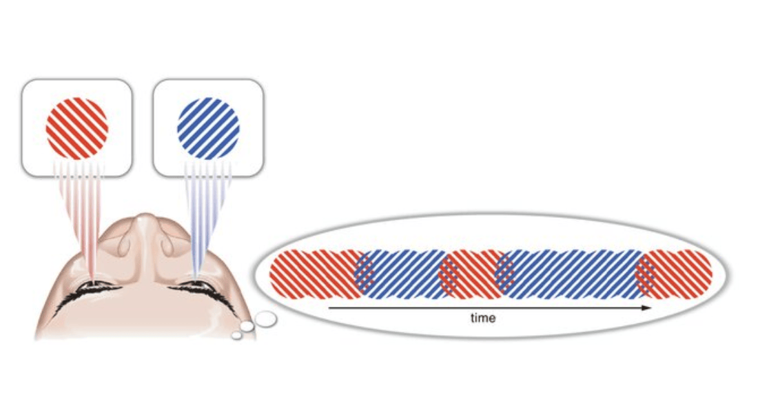用科学解释,对于人类和眼睛朝前的动物来说,双眼看到的景象只有细微的差别。每只眼睛的晶状体都会将光线聚焦在视网膜上,形成二维图像。在正常视觉中,视网膜图像之间的差异为感知第三空间维度——深度——提供了立体视觉线索。但是,当双眼面对一对无法融合形成连贯感知的图像时,双眼合作就会转变为竞争。此时,感知会在双眼图像之间交替呈现,因为它们会争夺感知优势。