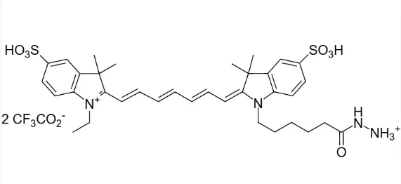 Cy7 是一种常用的近红外荧光染料,激发波长约 750 nm,发射波长约 770–780 nm。近红外特性使其在生物样品中背景低,可用于多色成像及深层组织成像。酰肼是一种活性化学基团,能与醛基或酮基形成共价连接。Cy7-HZ 中的酰肼端可与含醛基的分子(如氧化后的糖链、糖蛋白)反应,实现荧光标记。