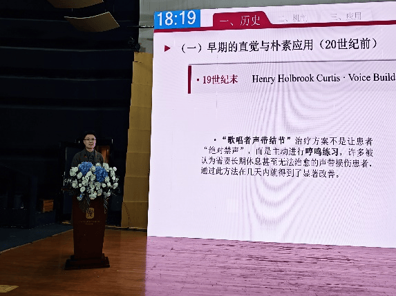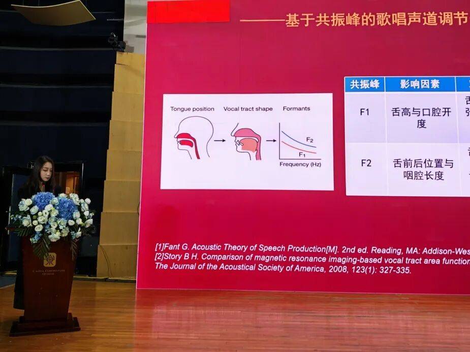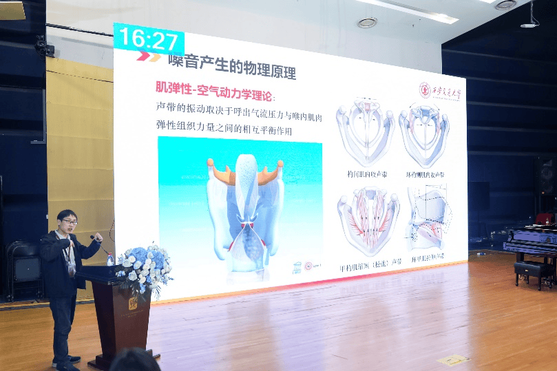 上海华东师范大学陈臻副教授系统介绍了许多嗓音障碍及其对应的行为治疗常用方法,用生动的案例展示了嗓音矫治的康复效果,提供了科学的、可操作的康复路径;广东省人民医院康竞博士则详细梳理了从嗓音评估到矫治的标准化操作规范,从呼吸、共鸣、声带振动方面的协调训练,到半闭塞声道练习,体现了言语康复学的专业化发展水平;江西南昌师范学院的张本安、幸灵敏副教授的报告展示了咽音练声法及嗓音训练在培养师范生中的模式,及其对未来教师的嗓音素养与教学效能的积极作用;我校在读硕士廖一凡、苏航对半闭塞声道练习方法的机理与应用进行了阐述,从声道对气流的阻抗角度为这一传统声乐训练方法提供了科学机理解释,并提供了实用操作方法。