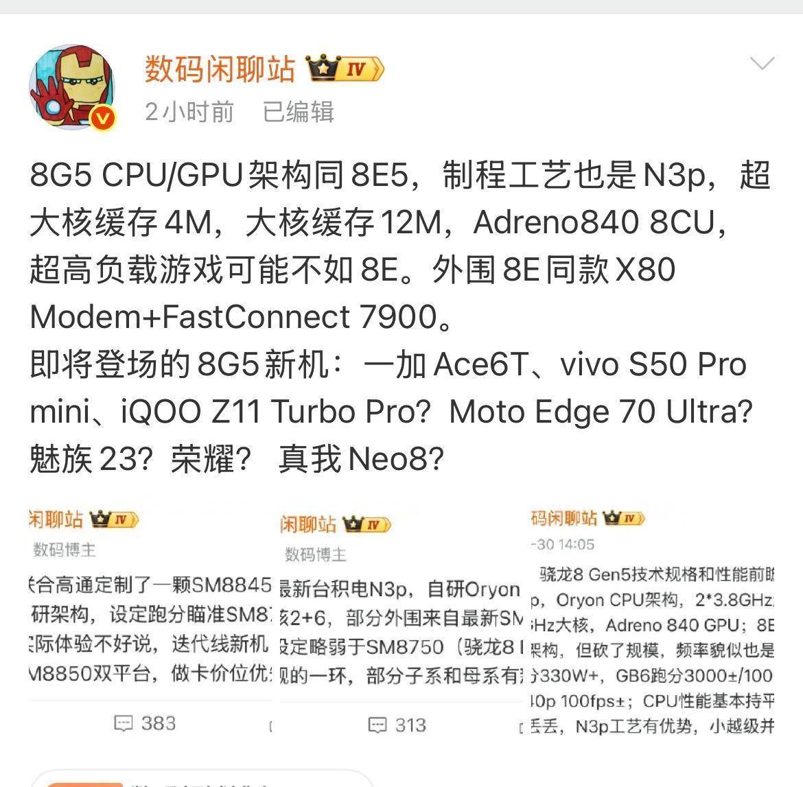包括@数码闲聊站 爆料中提到的一加Ace 6T、vivo S50 Pro mini、iQOO Z11 Turbo Pro、Moto Edge 70 Ultra、魅族23、荣耀及真我Neo8等多款新机,均已规划搭载此芯片。