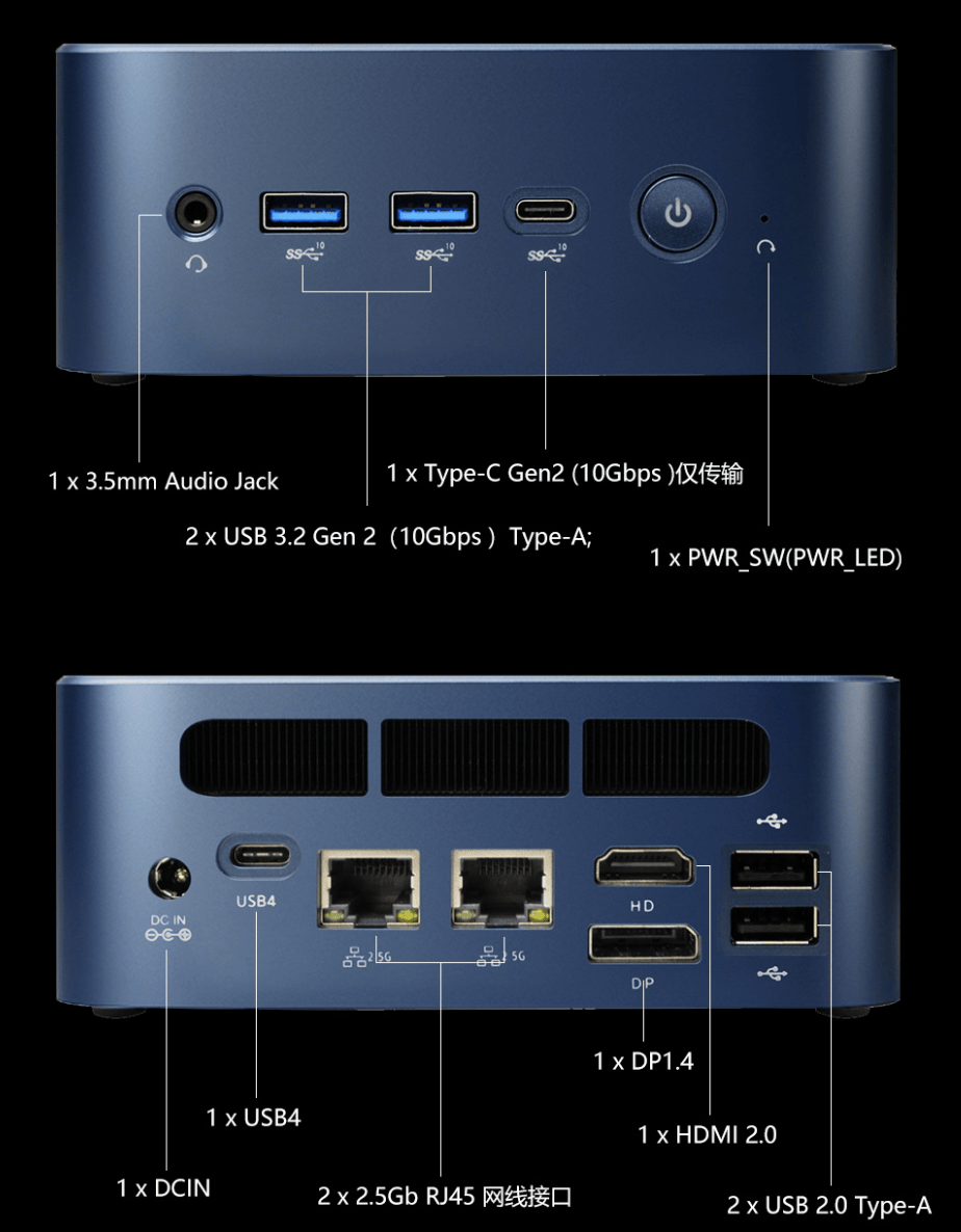 · 后置面板:后置面板为两个USB2.0接口,一个HDMI2.0接口,一个DP1.4接口,两个2.5G网口,一个USB4的TypeC口,再加上一个DC电源口,这就意味着最多可以支持HDMI+DP+TypeC 3屏显示4K60Hz。