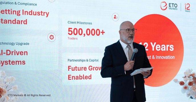 在热烈掌声中,ETOMarkets 董事Jonathan Barratt先生登台发表开幕致辞。他首先向长期支持ETO Markets的合作伙伴致以衷心感谢,并回顾品牌十二年来的稳健发展历程。他指出,十二年的积累不仅意味着阶段性的圆满,更象征一次全新进阶的开始。