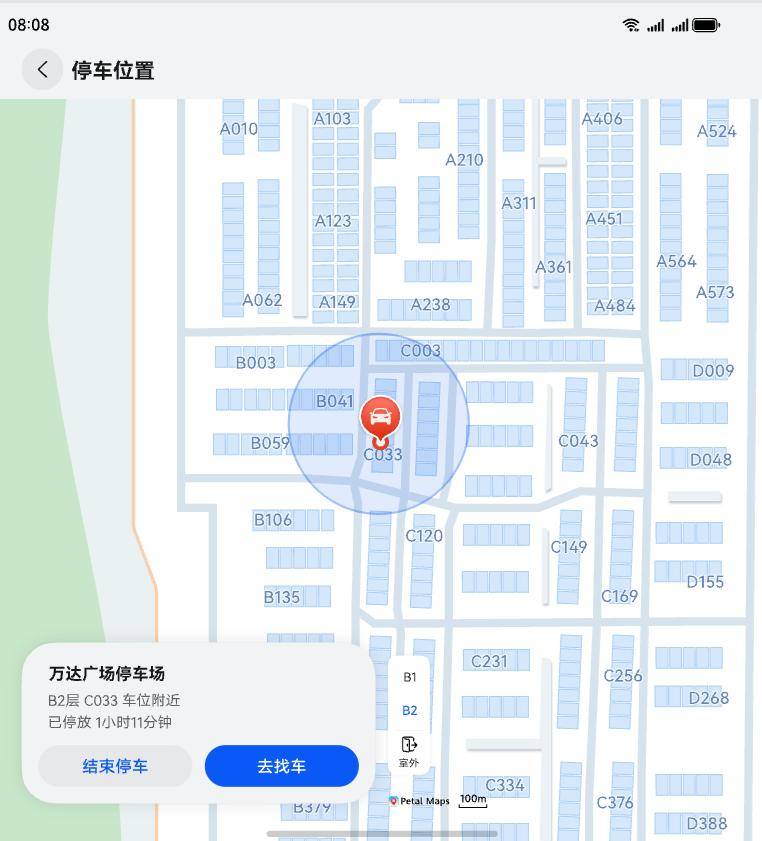 与传统商场导览不同,你无需进行任何手动操作,当你驾车进入支持的停车场停稳后,负一屏便会自动感知并生成一张包含楼层、车位、地库室内地图。购物结束只需右滑一下,卡片即刻呈现,不用回忆楼层,也不用输入车位号。点击“去找车”,它能直接调起花瓣地图,像室外导航一样为你规划清晰的步行路线,哪怕是在复杂的多层地库,也能通过楼层切换面板精准定位。告别“盲找”和“扫码”,让寻车超便捷、更从容。
