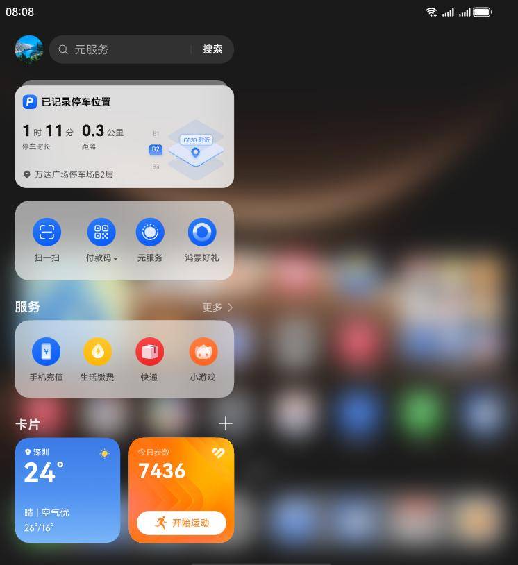 熟悉鸿蒙系统的用户知道,自HarmonyOS 5.1起,负一屏就已通过服务动态卡片、快捷工具、八宫格服务区和自定义服务卡片四大模块,覆盖了日常高频需求。而伴随新机登场,负一屏上线了全新的服务动态卡片:精准寻车。