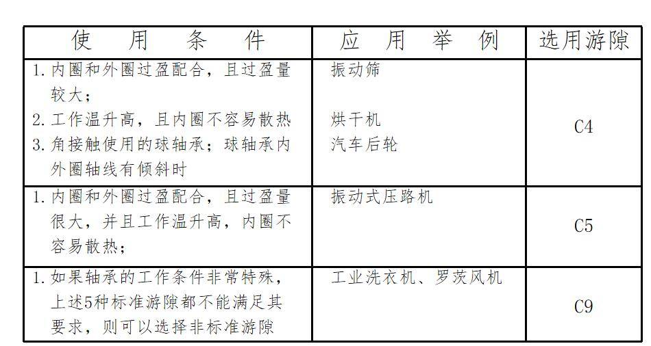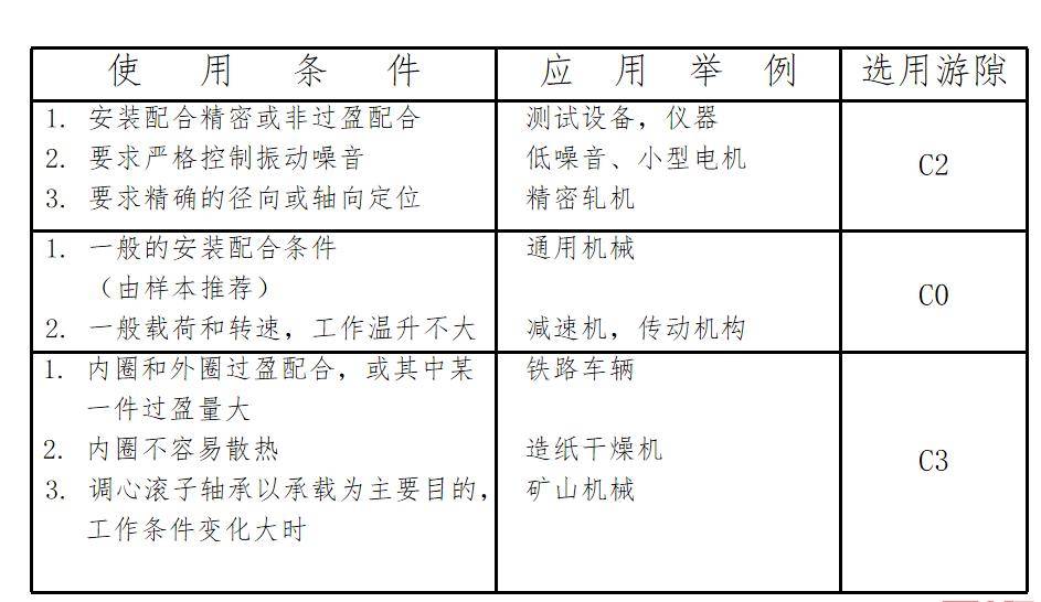 因此当工作条件变化较大,安装配合控制得不严,内圈散热条件差,从安全性考虑,则应保留一定的有效游隙,或以最坏情况来验算有效游隙。如用户没有条件做有效游隙验算时,可以参照下表选择游隙。