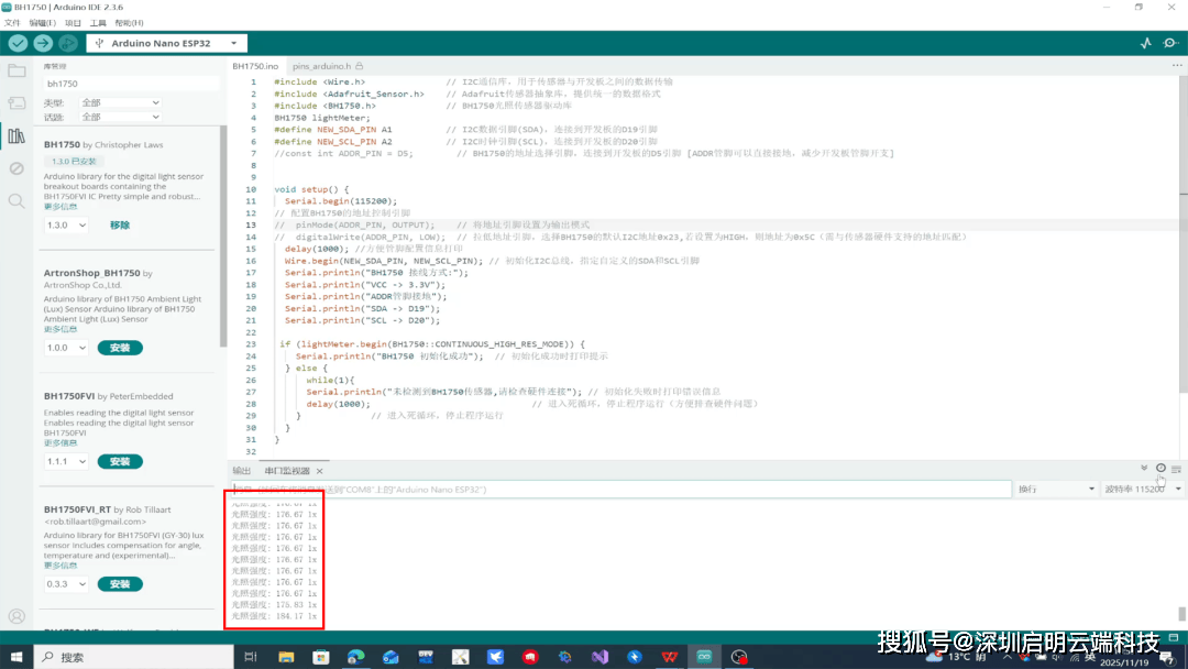 我们通过 I2C 通信协议读取 BH1750 传感器数据,即可实时获取当前环境的光照强度值。