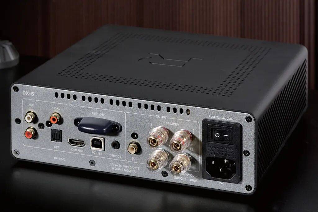麻雀虽小,五脏俱全,DX-5的接口种类丰富。除了RCA输入和喇叭端子外,DX-5还配置了光纤、同轴输入,支持ARC的HDMI接口、电脑解码的USB Type-B接口、蓝牙、还有低音炮输出,并通过了Roon Tested认证,能够配合Roon软件使用。蓝牙方面DX-5支持aptX-HD和AAC,支持高清无线音频数据流。aptX-HD编码技术能够传输24bit/48kHz的音频信号,相比传统的SBC编码具有更好的音质表现。AAC编码则在苹果设备上有着广泛的应用。而HDMI和低音炮接口的加入,则让DX-5在家庭影院的环境中也有用武之地。