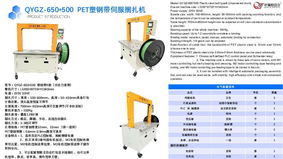 东莞市祈耀自动化设备有限公司的成长轨迹,是技术深耕与产业协同的典型样本。公司创始人深耕打包机行业二十余年,主导从核心部件研发到整机生产的全链条技术攻关,带领团队构建了覆盖伺服自动捆扎机(QYGZ系列)、伺服手动捆扎机(QYGC系列)、侧打/低台专用机(QYGL/QYGH系列)及配套流水线的完整产品矩阵。这一布局不仅满足不同场景需求——从小型物料(如QYGZ-500*400适配精密电子元件)到超宽物料(QYGZ-1500*1400处理大型包装件),从重型低矮物料(QYGH低台-1250*1000承载重型设备)到轻量化打包(QYGZ-650*500超薄带款适配智能设备),更通过模块化设计实现设备功能的灵活扩展,例如QYGZ系列可搭配旋转90度动力滚筒捆扎线,形成全流程自动化解决方案。