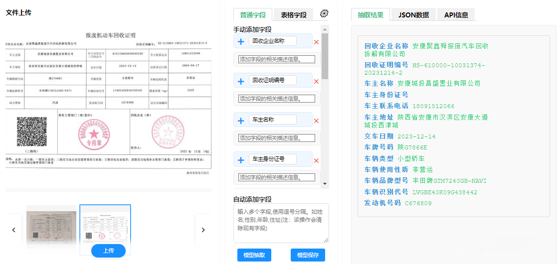 - 精准的OCR与关键信息抽取:在完成版式分析后,系统对各个模块内的文字进行高精度OCR识别。随后,利用自然语言处理技术,结合保险行业的专业知识库,系统能够理解识别出的文本的语义。例如,它能准确判断“号牌号码”后的字符串是车牌号,“发动机号”后的一串字符是发动机编号,并将这些关键信息自动抽取并结构化为标准的、机器可读的数据字段。