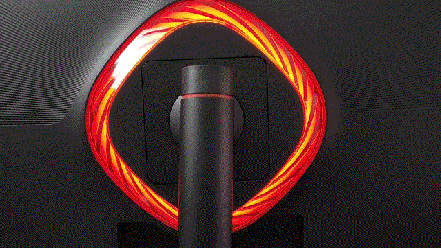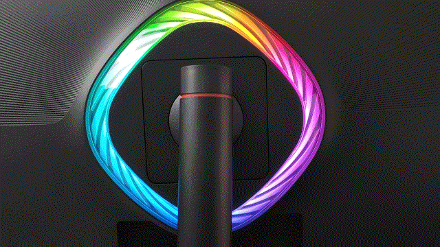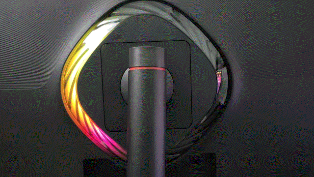 背部的RGB大环形灯区的设计,以及线性支架为整体增添了科技感和电竞气息。其支架的设计则彰显了机械电竞风格,棱角分明,稳固的结构使得显示器在使用过程中不易晃动。