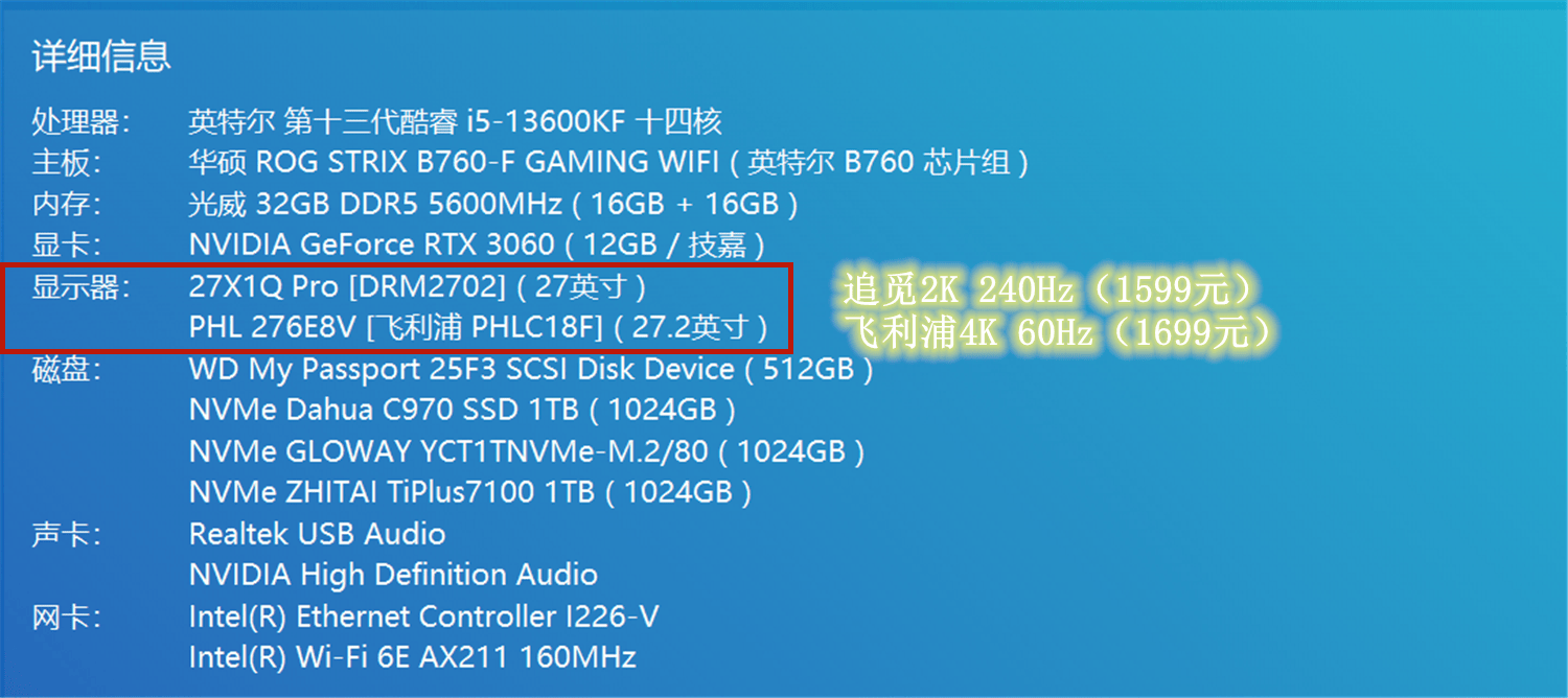 前者(飞利浦4K 60Hz)1669元,后者(追觅2K 240Hz高刷)1599元,无论是刷新率还是色彩表现/色彩管理以及辅助性,追觅都完胜前者,比预期表现让我体会到了什么是惊喜。