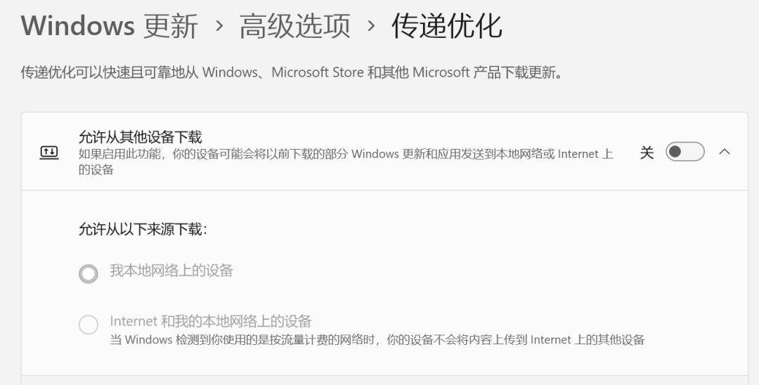方法:设置 - Windows 更新 - 高级选项 - 传递优化 - 关闭“允许从其他设备下载”选项