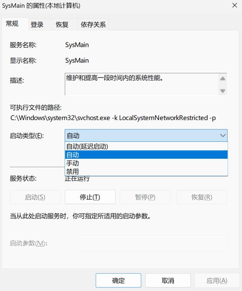 方法:Win+R输入“services.msc”,找到SysMain,右键“属性 - 禁用 - 停止”。